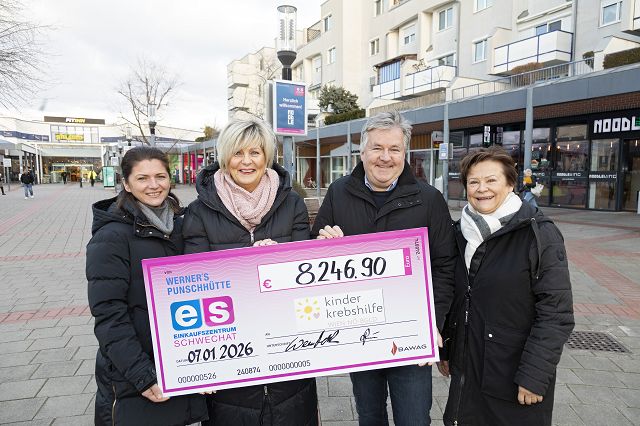 Das Einkaufszentrum Schwechat und die Familie Zettl sind überglücklich über den Erfolg der Charity Aktion im Dezember. Beim Charity Punschtag am 11.12.2025 bei Werner´s Punschhütte ist es gelungen, einen Rekord-Spendenbetrag von € 6.246,90 für die Kinderkrebshilfe Wien-Nö-Bgld zu sammeln.